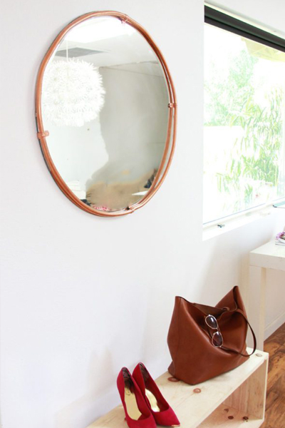 Sáng tạo một chiếc gương tròn lớn treo trong nhà đế soi trước khi bước ra ngoài. Bọc đồng quanh gương tăng vẻ đẹp sang trọng và hiện đại, tiết kiệm chi phí.