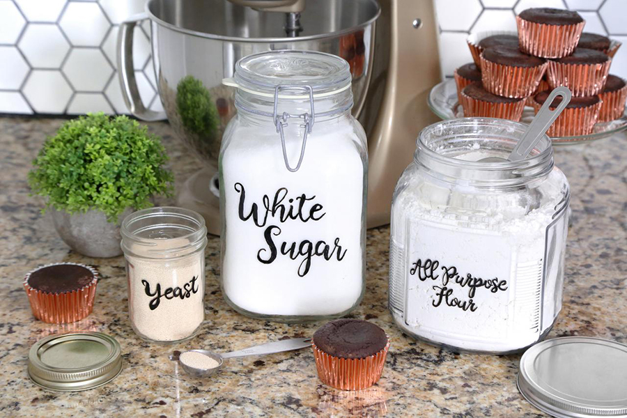 Tạo nét mới lạ cho chiếc hủ gia vị cũ bằng cách phun sơn lên đỉnh lọ thủy tinh nhằm mang lại vẻ ngoài tươi mới để sử dụng trong bếp, đựng các vật dụng làm bánh như bột, đường…