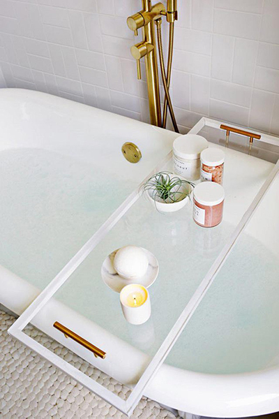 Sau một ngày dài vất vả, thả mình vào trong một chiếc bồn tắm thư giãn không gì là sự sung sướng và khó có thể cưỡng lại. Hãy nuông chiều bản thân bằng cách biến phòng tắm thành nơi nghỉ dưỡng như spa với bồn tắm sáng bóng sang trọng dùng để ngâm mình, thoa kem dưỡng da, tắm bọt xà phòng nên nến, đọc sách hay thưởng thức 01 ly rượu vang đặt trên khay tự chế gọn gàng trên các cạnh của bồn tắm.