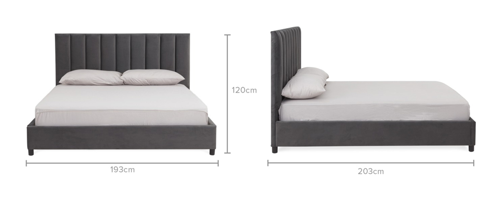 Kích thước (cm): - Queen: R163 x S203 x C120; - King: R193 x S203 x C120. Chân giường (cm): 7. Kích thước nệm (cm): - Queen: R153 x S191; - King: R183 x S191. |