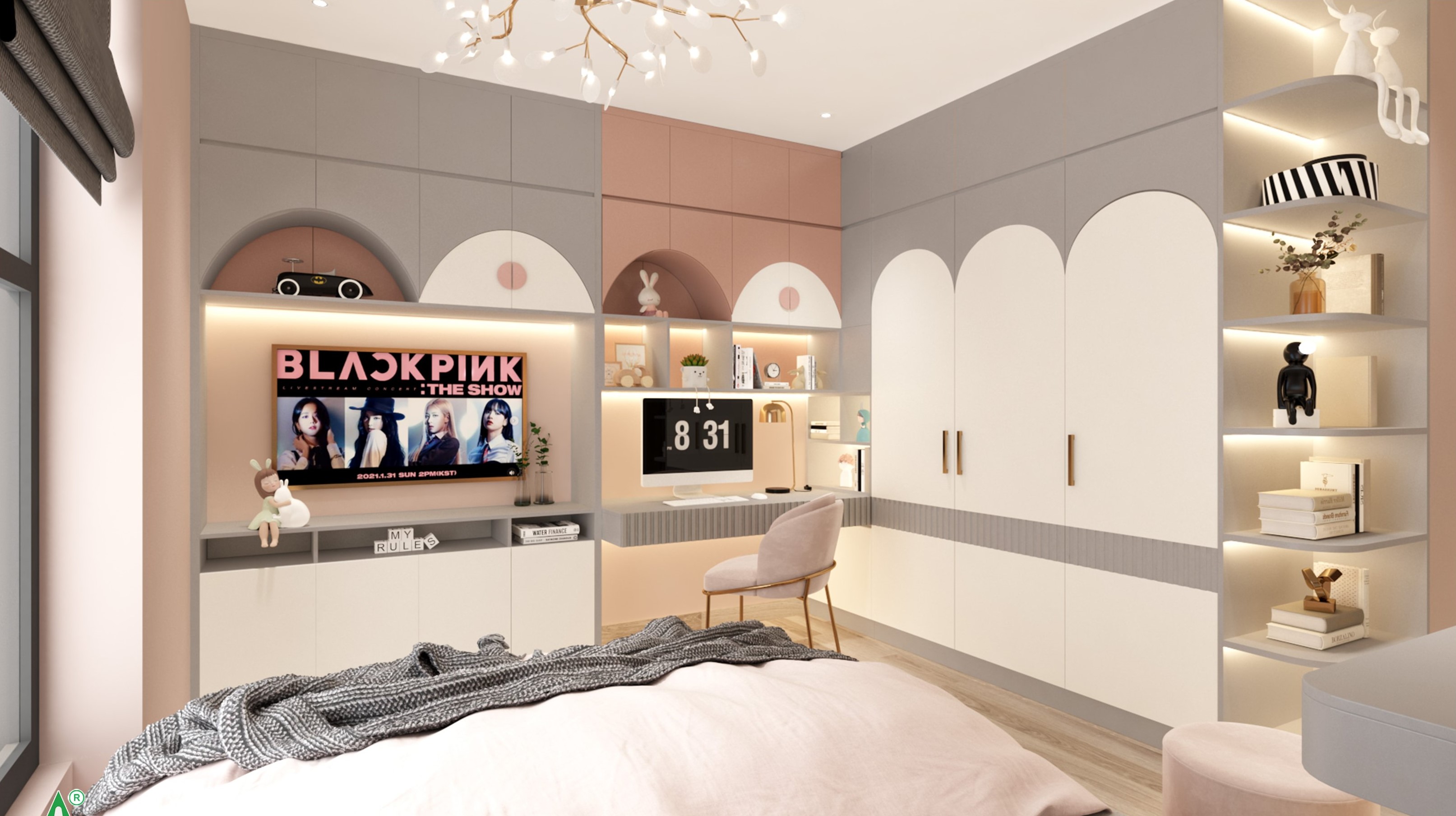 Phòng ngủ hiện đại với gam màu hồng thơ mộng, đáng yêu phù hợp với các bé.