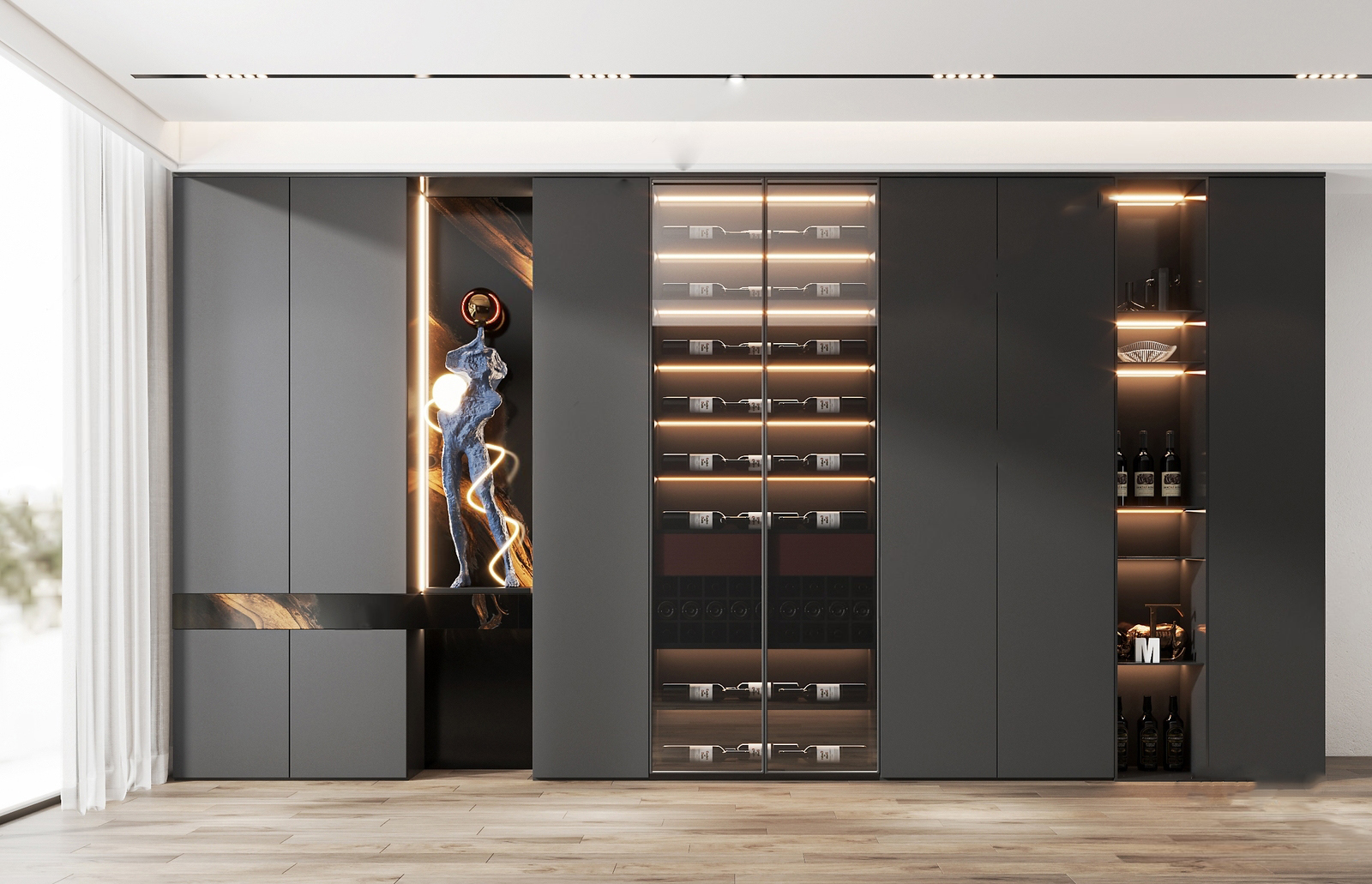 Tủ rượu hiện đại có thiết kế đơn giản, gọn gàng, không cầu kỳ, rườm rà. Các đường nét sắc sảo, tinh tế, mang lại vẻ đẹp sang trọng, đẳng cấp cho không gian.