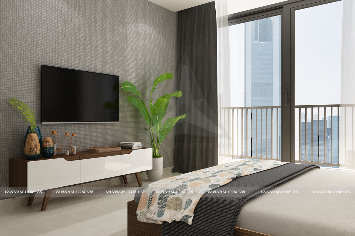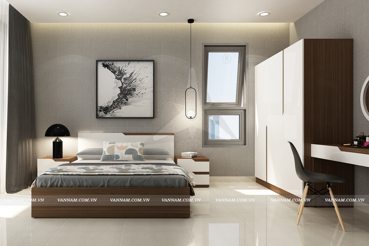 Phòng ngủ hiện đại với hai gam màu trắng cùng vân gỗ mang đến không gian sống ấm cúng và sang trọng.