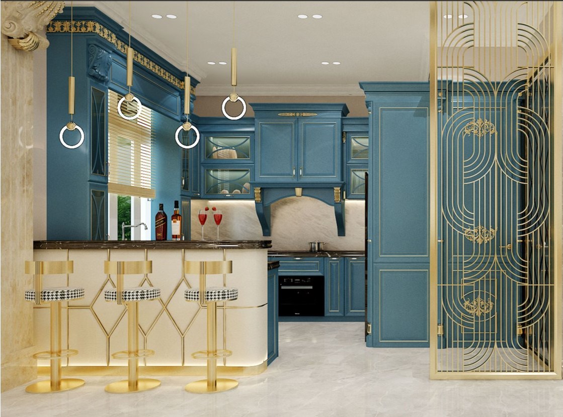 Tủ bếp có quầy bar là kiểu dáng sang trọng và đẳng cấp. Quầy bar có thể được sử dụng làm khu vực pha chế đồ uống hoặc khu vực tiếp khách.