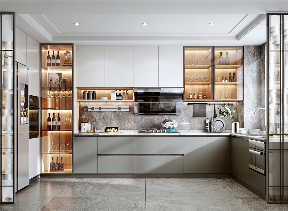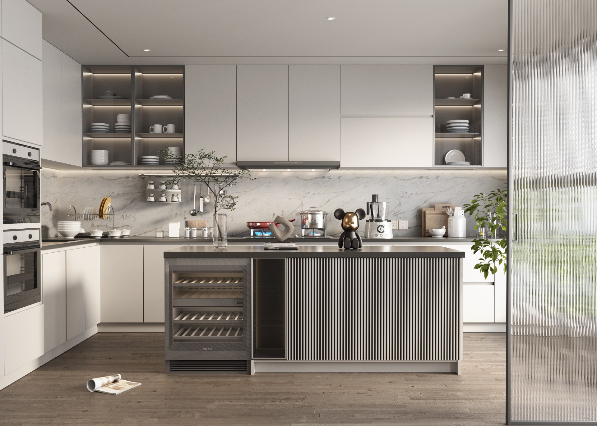 Bếp chữ U hiện đại kết hợp tủ rượu cánh kính