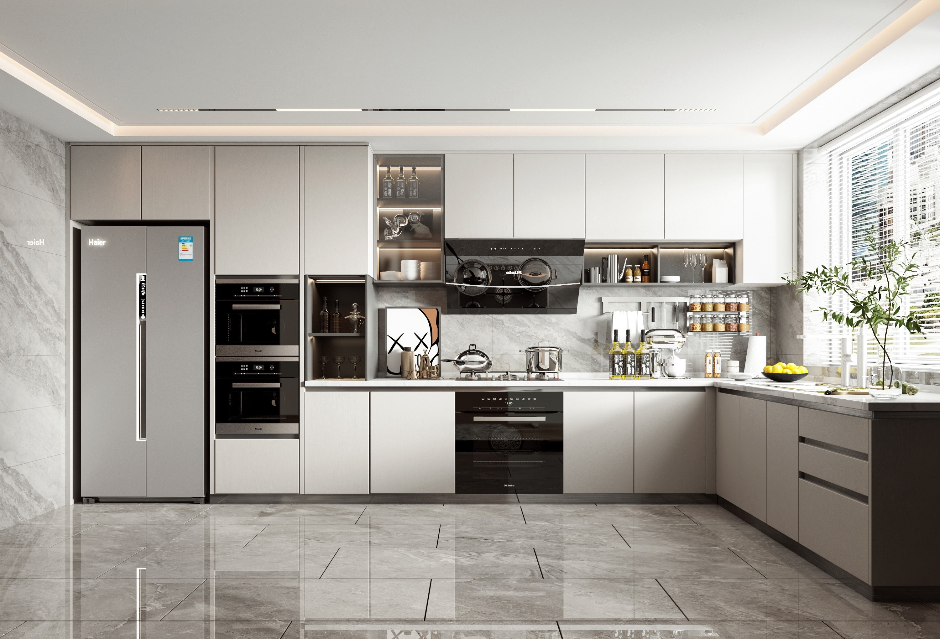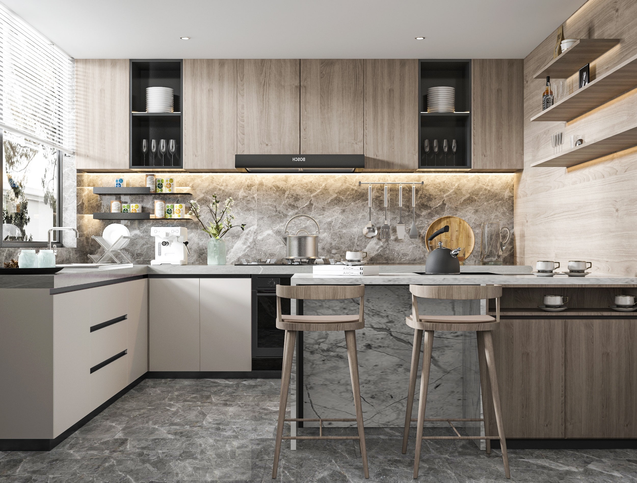 Kiểu dáng tủ bếp sang trọng và hiện đại, phù hợp với những không gian bếp rộng rãi. Tủ bếp chữ U tạo ra một không gian bếp quây quần, ấm cúng.